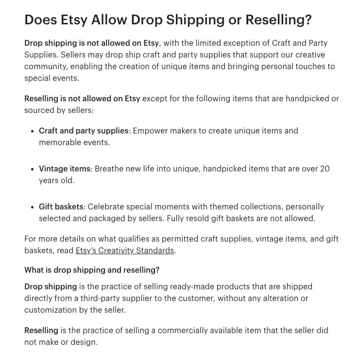Örneğin Aliexpress’te bir ürünü Etsy’de listeleyip, satış gelince Aliexpress’ten satın alıp göndermek şeklinde olan dropshipping modeli YASAK.
