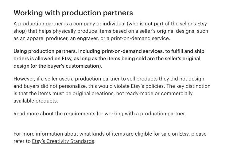 Etsy’de Amazon’da olduğu gibi platformlar arası dropshipping yapmak yasak. Ancak üretim partnerleri ile çalışmak serbest.