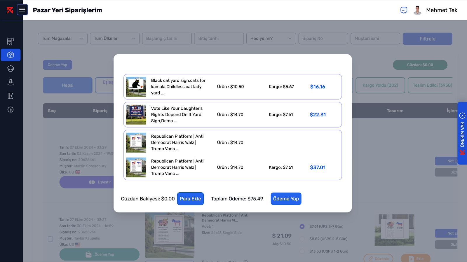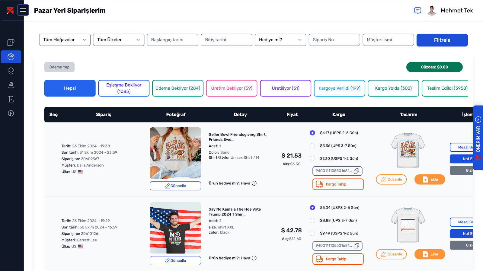 Biz şu anda Türkiye’den çıkan kargolarımız da ShipEntegra ile çalışıyoruz. Amerika içinde ise USPS ve UPS ile çalışıyoruz.