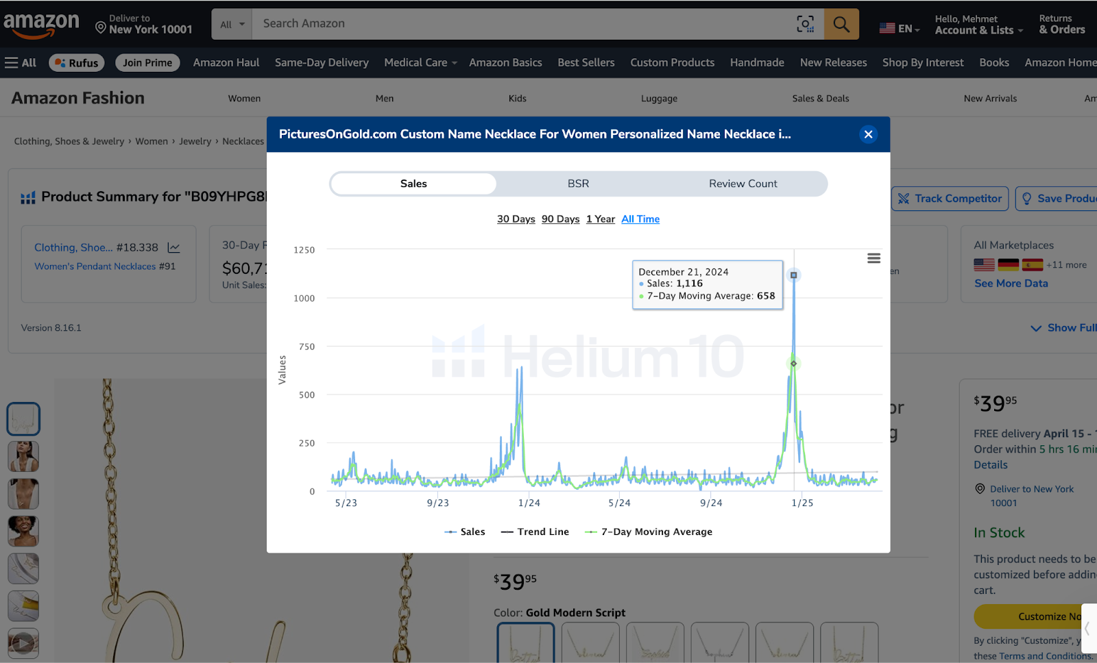 Bu satıcı son 30 günde 1099 ürün satarak $45.037 (1.756.938₺) ciro yapmış. Tam olarak ne kadar harcama yaptığını (ürün + kargo + reklam) bilemeyiz tabii ki ama ürünleri Rexven’den alıyor olarak hesapladığımızda ve %10 reklam harcaması ile tahminen son 30 günde $15.616 (609.195₺) net kâr elde etmiş.